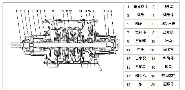 GC型水泵的主要零件有軸、軸套、�(jìn)水段、葉輪、導(dǎo)翼、密封環(huán)、中段、出水段、平衡環(huán)、平衡盤、尾蓋�